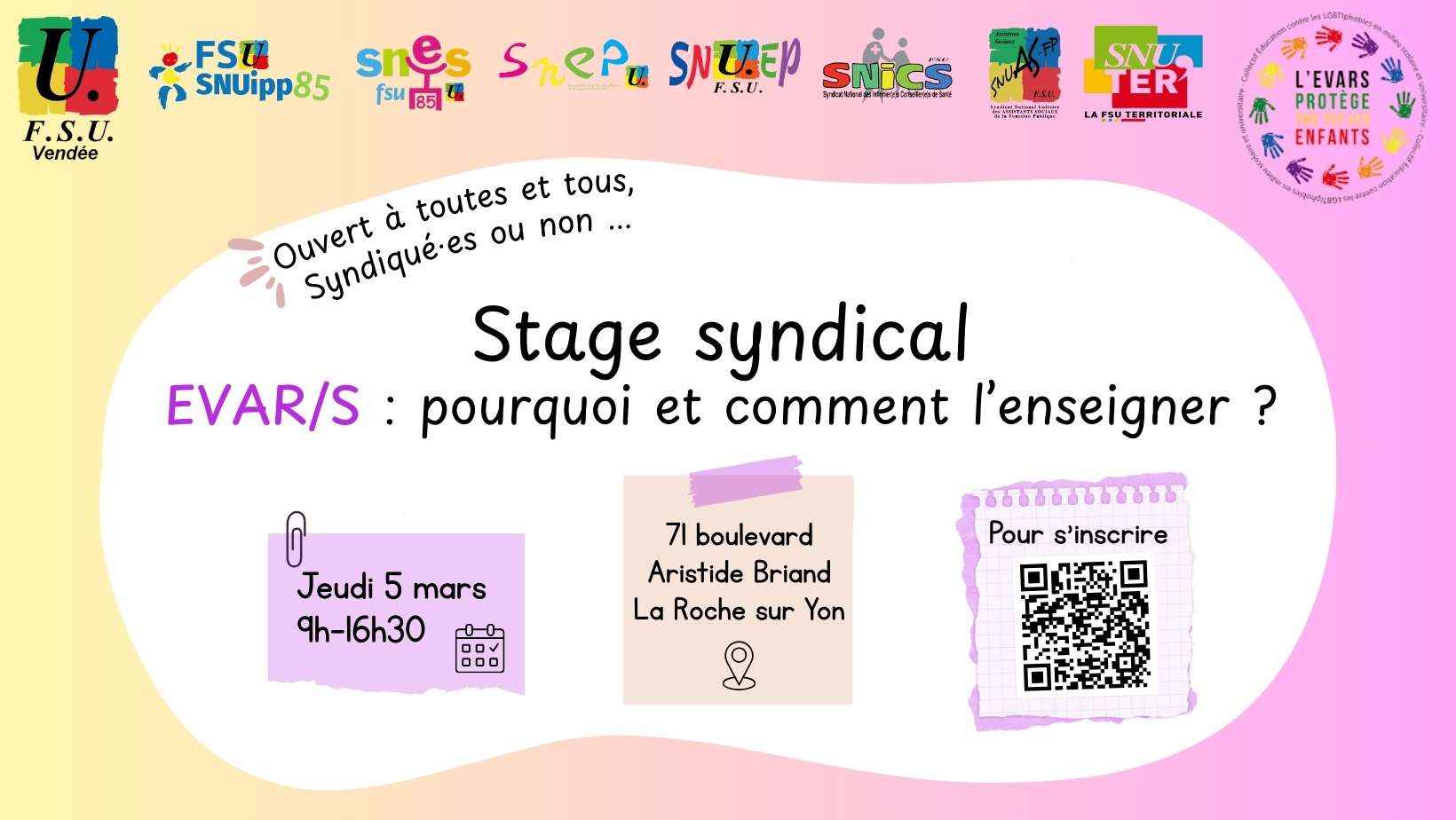 Participer au stage de formation syndicale de la FSU 85 sur l’EVAR/S. Il est ouvert à toutes et tous, syndiqué·es ou non.