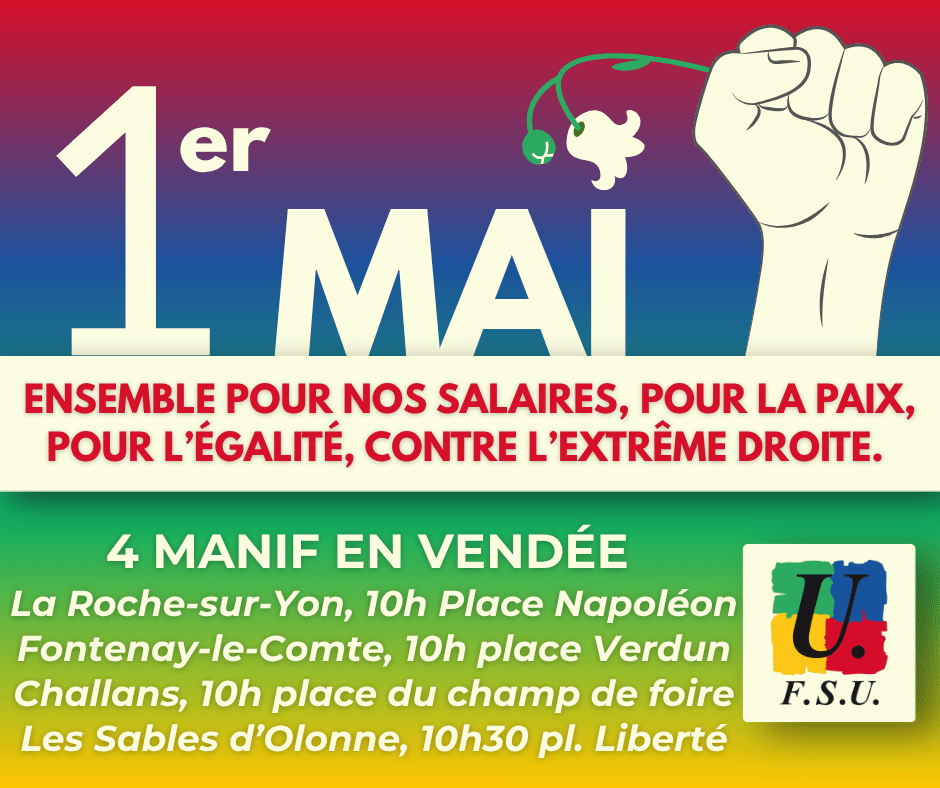 Un 1er mai dans l’action 2026-04-29T09:17:08+02:0029 avril 2026|Catégories : À LA UNE| Participons massivement aux rassemblements du 1er mai. 4 rendez-vous en Vendée, à l’appel de l’intersyndicale CFDT, CGT, FO, FSU, Soldiaires. L’appel départemental L’appel national Partagez cet article ! FacebookXWhatsAppTelegramEmail Articles similaires Stage de formation syndicale spécial AESH (le 17 juin 2026 à La Roche sur Yon) Stage de formation syndicale spécial AESH (le 17 juin 2026 à La Roche sur Yon) 28 avril 2026 L’abnégation de la FSU enfin récompensée ? L’institut catholique l’Espérance dans la tourmente L’abnégation de la FSU enfin récompensée ? L’institut catholique l’Espérance dans la tourmente 27 avril 2026 CSA Départemental second degré du 3 février 2026 CSA Départemental second degré du 3 février 2026 12 février 2026 Violences envers les enfants : il faut un Big Bang de l’animation ! Violences envers les enfants : il faut un Big Bang de l’animation ! 3 février 2026 Réaction de la FSU 85 aux révélations de Cash Investigation Réaction de la FSU 85 aux révélations de Cash Investigation 30 janvier 2026